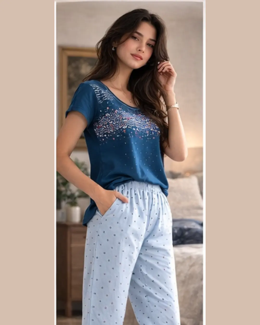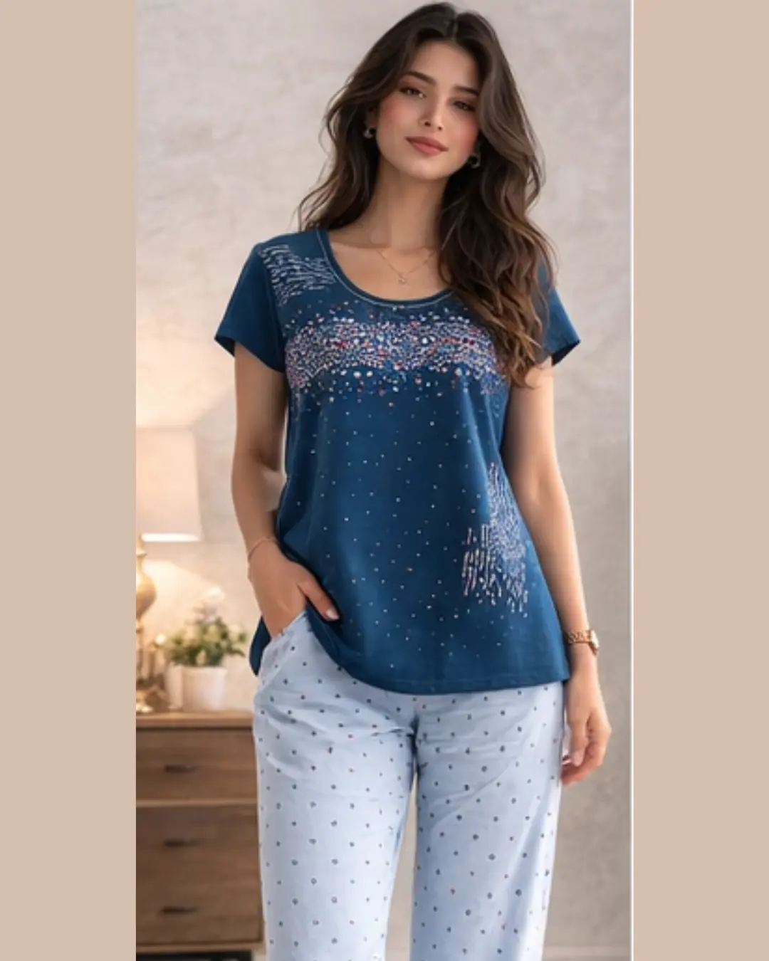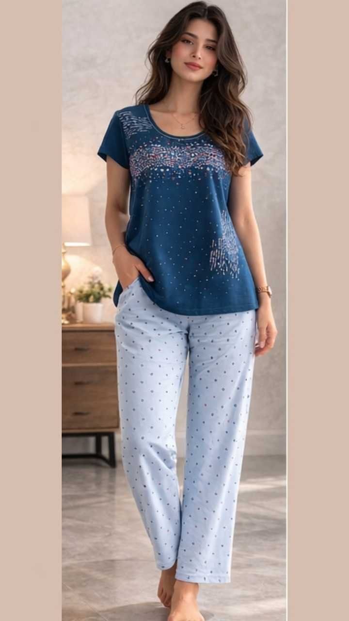Crafted from soft, breathable cotton, this two-piece set includes a printed short-sleeve top paired with comfortable elasticated lounge pants. The soothing blue tone, accented with delicate dotted and abstract prints, gives this set a calm, refreshing look that feels effortless on the skin.